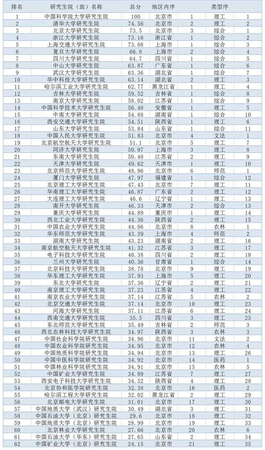 此次的榜單上的排名僅有62個,并且僅僅是內地的研究生院排名,并不包括部分軍事類院校和港澳臺地區高校。