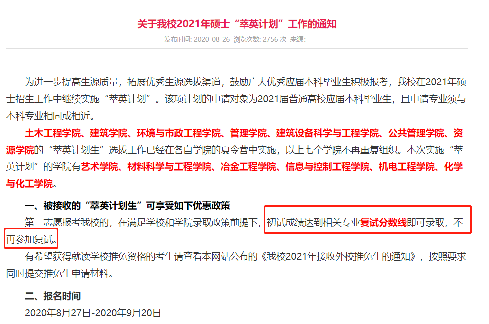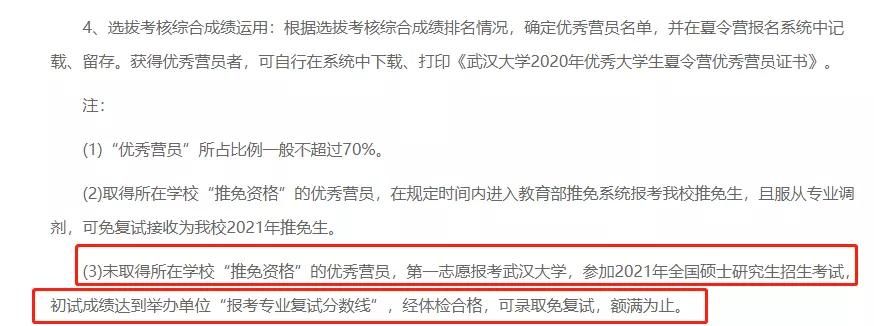 校方表示:部分未取得所在學校“推免資格”的優(yōu)秀營員,第一志愿報考武漢大學,參加碩士研究生招生考試,初試成績達到國家線和我院相應專業(yè)復試分數(shù)線,經(jīng)體檢合格,可錄取免復試。