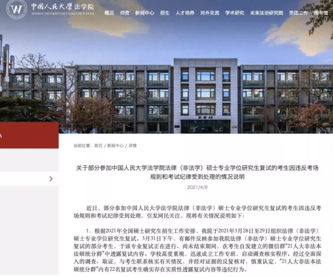 1.根據2021年全國碩士研究生招生工作安排,我院于2021年3月28日至29日組織法律(非法學)碩士專業學位研究生復試。3月31日下午,有郵件反映參加我院法律(非法學)碩士專業學位研究生復試的部分考生,于該專業復試正在進行、尚未結束期間,在考生自發建立的微信群“21人大非法本法碩統分群”中透露復試內容。學校高度重視,迅速成立工作專班,啟動調查核實程序。經過全面深入的調查、取證,與考生聯系核實有關情況,并經對證據的反復核對,慎重認定,“21人大非法本法碩統分群”內有22名復試考生確實存在實質性透露復試內容等違紀行為。
