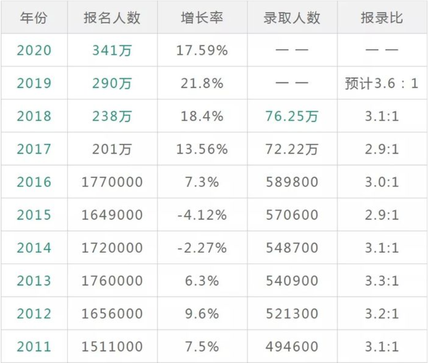 近年來考研的人數(shù)暴漲到害怕,2017年201萬,2018年238萬,2019年290萬,2020年340萬。(基金都不敢這么漲)這也變相說明了一個道理,如果一件事的參與人數(shù)不斷增長,起碼這條路是對的,只不過這條路過于優(yōu)質進而越來越擁擠罷了。