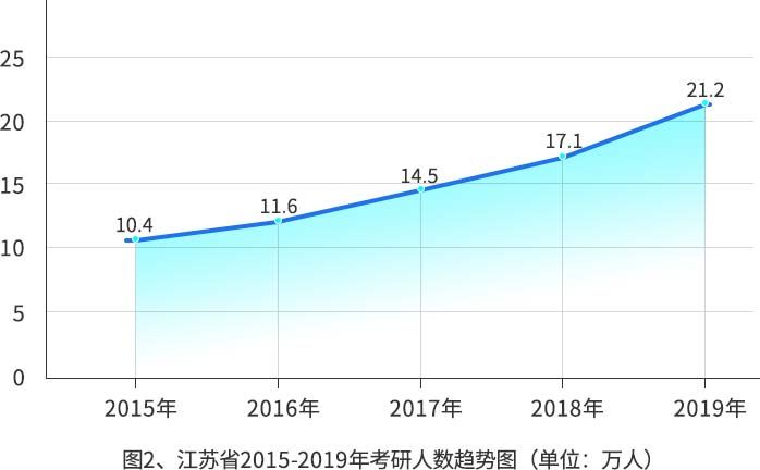 江蘇省一直是考研大省,從2015年的10.4萬人到2019年的21.2萬人,5年間,考研人數翻了一番還多。