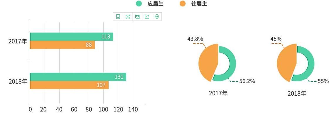 據(jù)教育部統(tǒng)計,2017年共201萬人報考,其中,應(yīng)屆考生113萬人,往屆考生88萬人;2018年共238萬人報考,其中,應(yīng)屆考生131萬人,往屆考生107萬人。從數(shù)據(jù)可知,2017年,往屆生考研人數(shù)占全國報考人數(shù)的43.8%,2018年,往屆生考研人數(shù)占全國報考人數(shù)的45%,同比上升了1.2%。