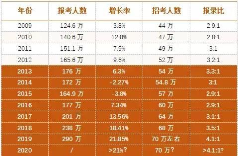 從2017年非全日制考研納入全國統(tǒng)一考試開始,考研人數(shù)就發(fā)生了爆炸式的增長。2017年考研人數(shù)201萬,2018年考研人數(shù)238萬,到2019年考研人數(shù)為290萬,按照這個趨勢發(fā)展,2020年人數(shù)突破300萬應(yīng)該不成問題。