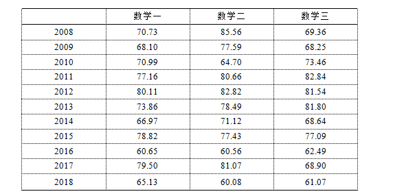 從近11年來看,數(shù)一最難的三年出現(xiàn)在2016年>2014年>2018年,數(shù)二最難的三年出現(xiàn)在2018年=2016年>2010年,數(shù)三最難的三年出現(xiàn)在2018年>2016年>2014年。鑒于大樣本下考研數(shù)學(xué)當(dāng)年平均分在70-75分難度適中,超過75分難度偏易,低于70分難度中上,低于65分難度過大。
