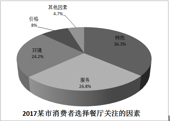 What is clearly presented in the above chart is the factors that consumers will take into consideration when they are choosing restaurants.Specifically speaking,the features of the restaurant account for 36.3%;the services account for 26.8% and surroundings take up 24.2%.
