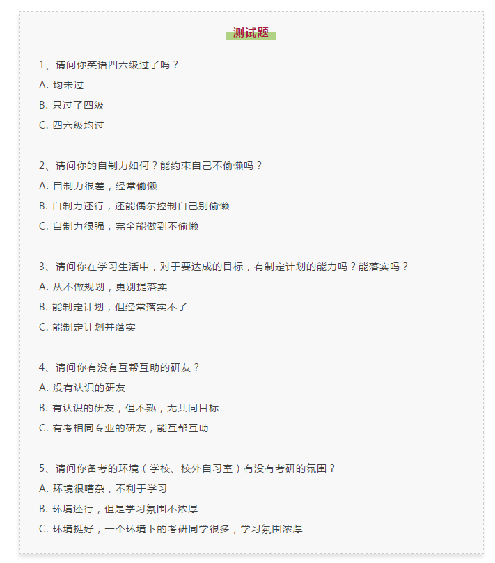 測試完了,你得了多少分呢?累積得分13分及以上,你可以考慮自學;累積得分13分以下,你可以考慮一下咨詢考研輔導班。
