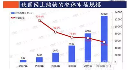 The statistics offered by the chart above illustrate the number changes in the overall scale of online shopping in China. From 2007 to 2012, the overall scale underwent an obvious increase, rising from 62 billion to 1300 billion, while the annual rate of growth had a decrease, falling from 125.8% to 60.7%.