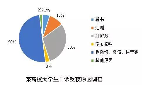 According to the survey on the causes of students staying up late daily in a certain college, using social media software apps, such as Microblog, WeChat and Tic Tok, accounts for half, namely 50 percent. The reason which is in the second place is attributed to playing video games.While other reasons, including watching TV shows, reading books, roommates’ influence and others, take up the minority proportion.