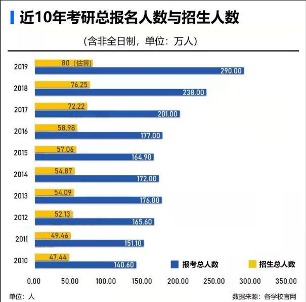 2019年,我國碩士研究生報名人數290萬,統計局公布的全年研究生招生是91.7萬人。根據第三方的不完全統計,2019年全國各大院校博士招生人數大約在7.5人至8萬人左右,那么,2019年碩士研究生的最終招生在83萬左右,碩士研究生錄取率約為2.86:1。這個數據與近年來的研究生錄取率基本一致,都是在3:1左右徘徊。