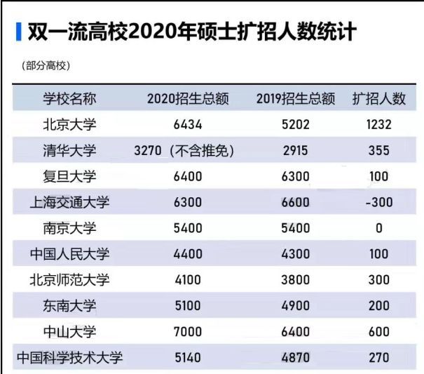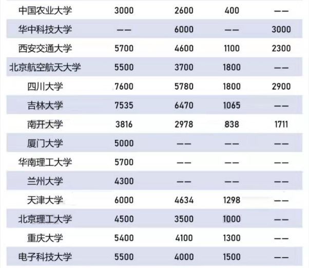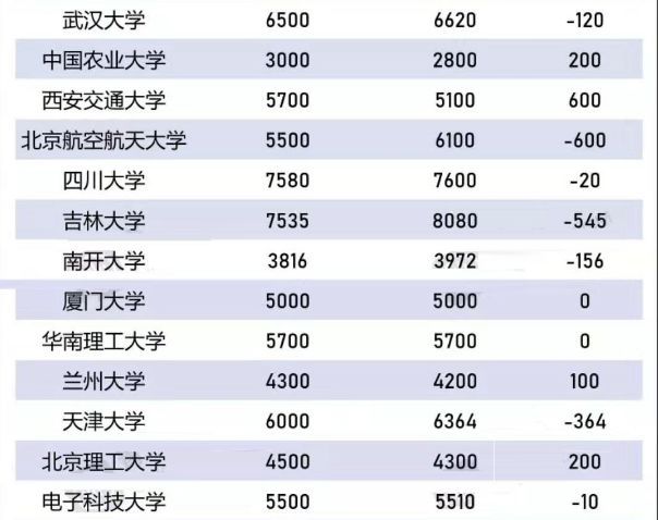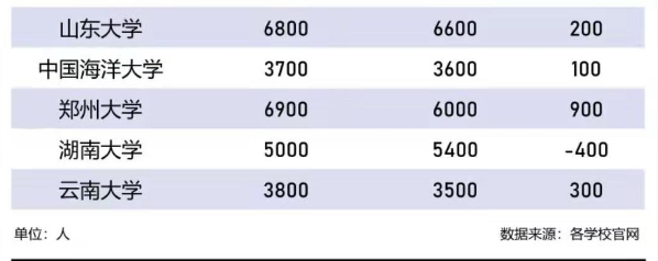 除了大多數雙一流高校進行擴招以外,還有廈門大學、南京大學、華南理工大學等部分高校基本上與去年持平,但這些高校2020年招生計劃皆已超過5000人,分別為5000人,5400人和5700人。