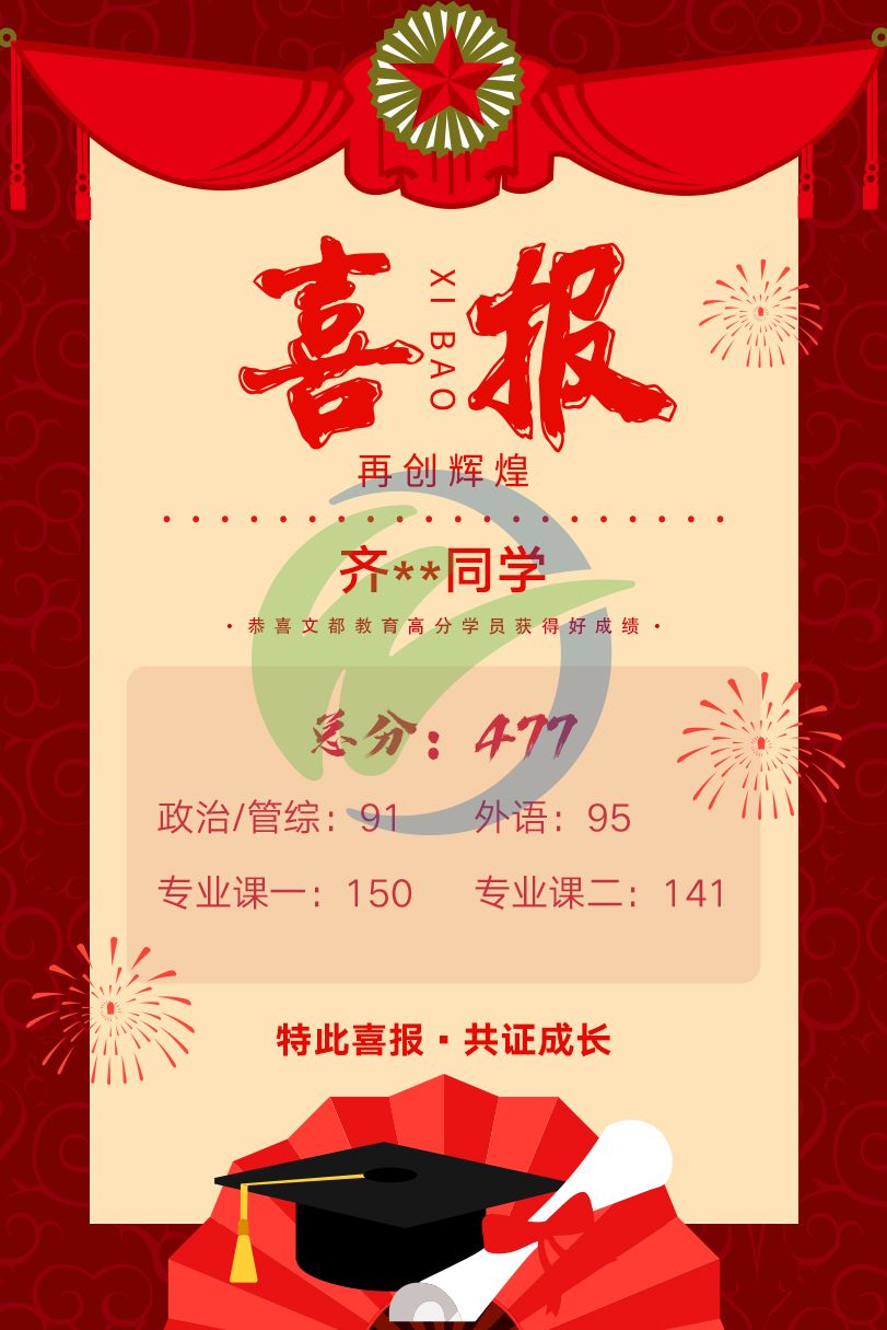 考研初試成績已經(jīng)出來啦,文都學(xué)子喜報(bào)頻傳,文都老師快被大家的私信給淹沒啦,數(shù)三滿分的答卷,藝考滿分的手繪卷,管綜的高分,不得不說這屆學(xué)員真的太優(yōu)秀了!所有的付出和努力,吃過的苦,熬過的夜都作數(shù),不必羨慕別人的分?jǐn)?shù),從最細(xì)微處做起,明年的高分榜一定有你。接下來一起看看我們文都考研優(yōu)秀的學(xué)子的初試捷報(bào)吧。