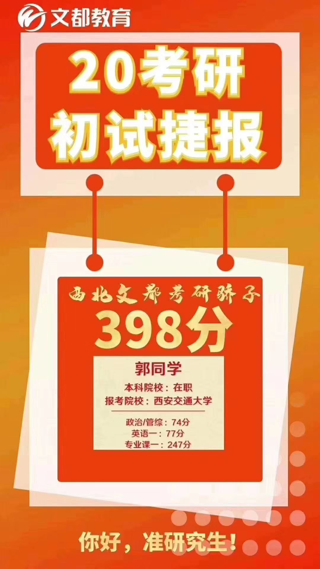 文都簡介:陜西文都,成立于2009年,致力于為考研學子提供一站式全方位輔導服務。目前,陜西文都已建立起包括遠程一卡通、全科彩虹卡、單科通關班、短期特訓班、全科特訓班在內的考研課程體系,基本覆蓋了考研學子所有課程需求。陜西文都教育共有12大分校,在西安高校建立起58個教學點,每年招生規模達萬余人,400+高分學員層出不窮,作為陜西省著名考研輔導品牌,以其先進的教學理念、優質的學員服務和出色的教學成果,贏得了眾多考研學子的好評和信賴。