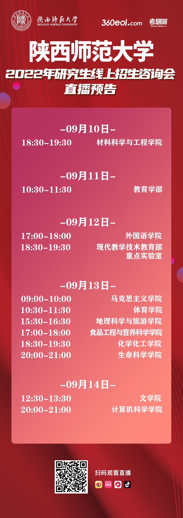 陜西師范大學(xué)2022年研究生線上招生咨詢會(huì)場次安排如下: