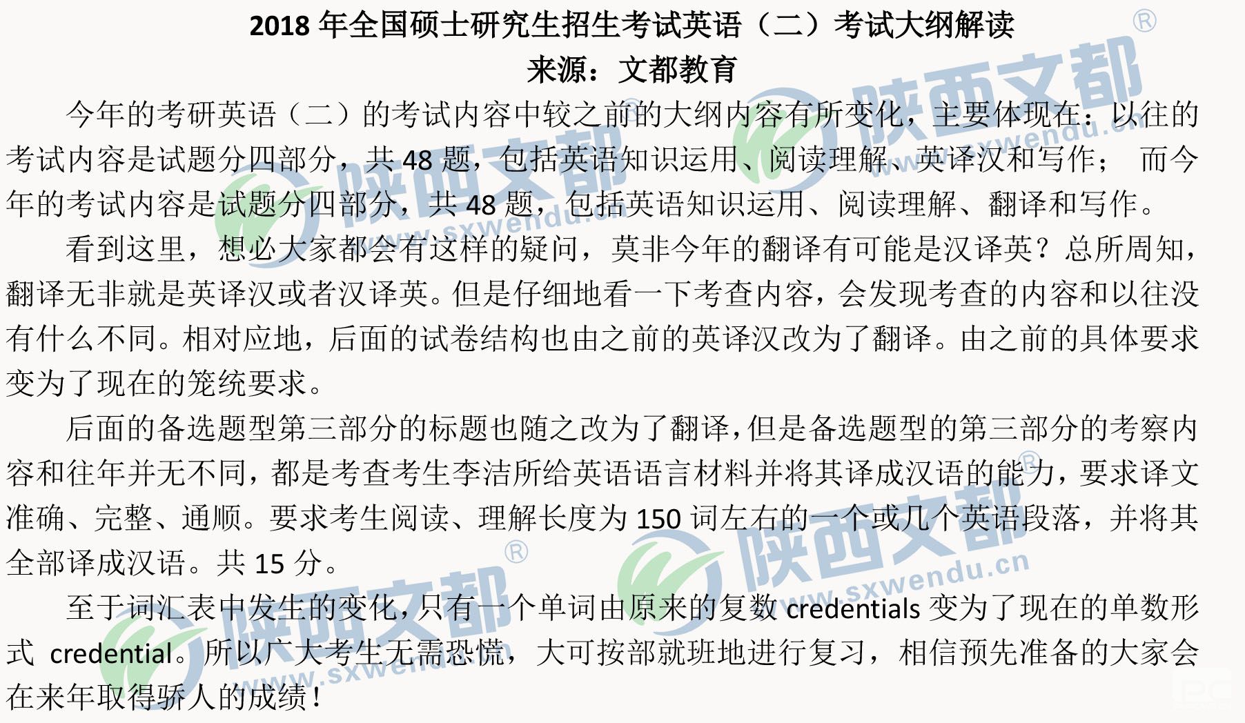 2018年研究生招生考試英語考試大綱的考試性質、考查目標、考試形式、考試內容以及試卷結構均沒有任何變化,同學們可以繼續有條不紊地復習。在備考的過程中,注意分配好各個部分的復習時間。在薄弱環節多下功夫。