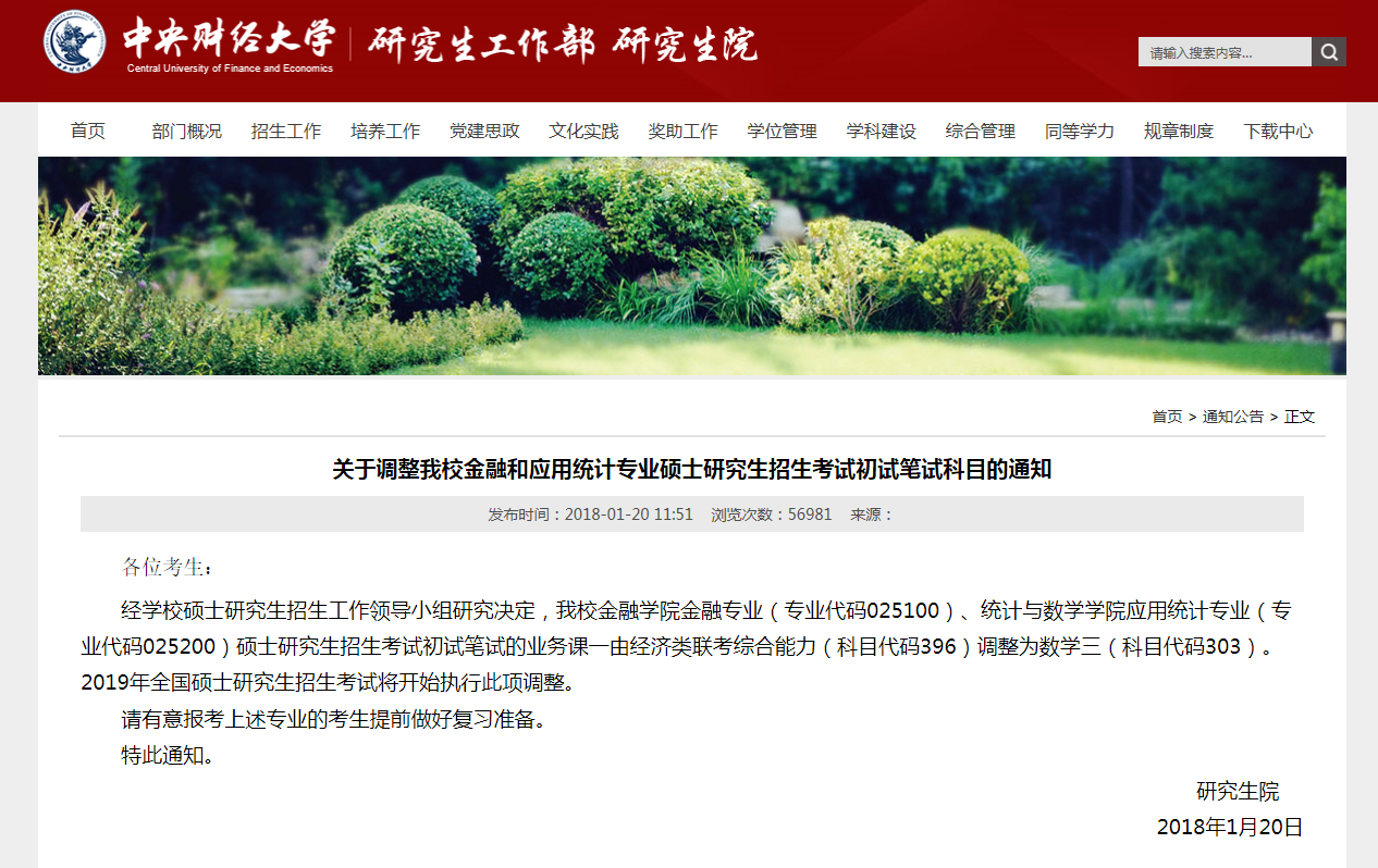 中央財經(jīng)大學金融學院金融專業(yè)(專業(yè)代碼025100)、統(tǒng)計與數(shù)學學院應用統(tǒng)計專業(yè)(專業(yè)代碼025200)碩士研究生招生考試初試筆試的業(yè)務(wù)課一由經(jīng)濟類聯(lián)考綜合能力(科目代碼396)調(diào)整為數(shù)學三(科目代碼303)。