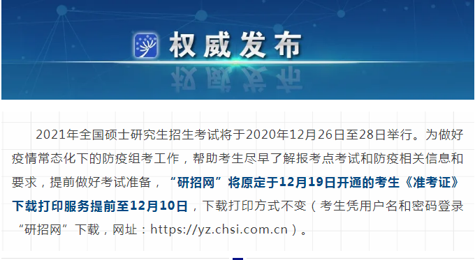 2021年全國碩士研究生招生考試將于2020年12月26日至28日舉行。為做好疫情常態(tài)化下的防疫組考工作,幫助考生盡早了解報(bào)考點(diǎn)考試和防疫相關(guān)信息和要求,提前做好考試準(zhǔn)備,“研招網(wǎng)”將原定于12月19日開通的考生《準(zhǔn)考證》下載打印服務(wù)提前至12月10日,下載打印方式不變(考生憑用戶名和密碼登錄“研招網(wǎng)”下載,網(wǎng)址:https://yz.chsi.com.cn)。