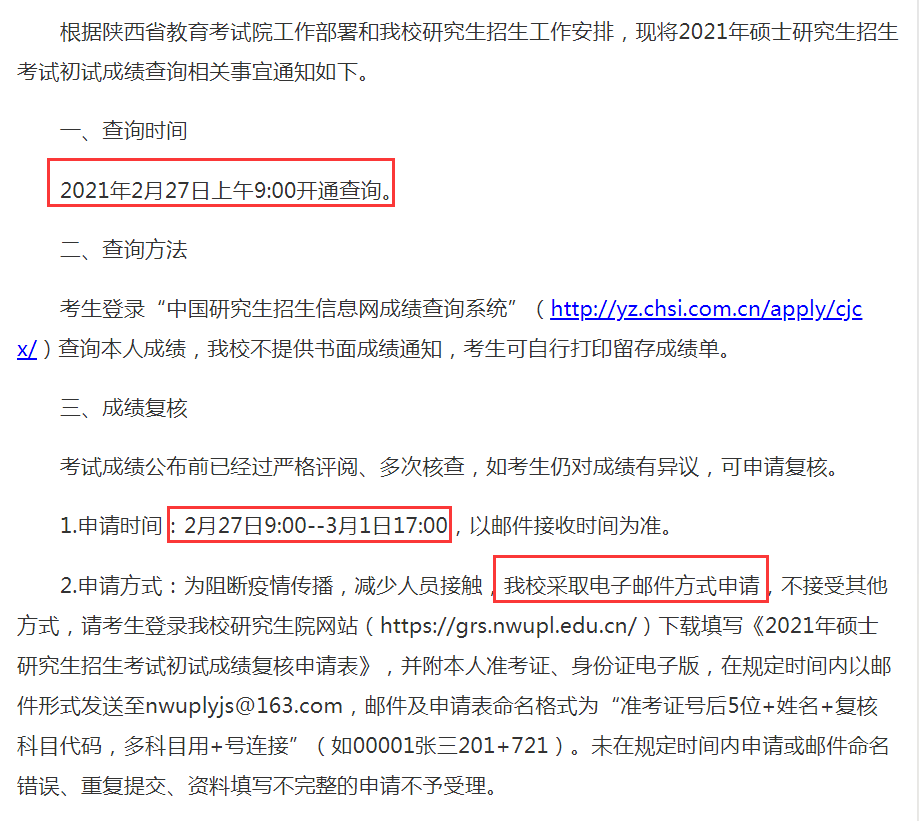 2.申請(qǐng)方式:為阻斷疫情傳播,減少人員接觸,我校采取電子郵件方式申請(qǐng),不接受其他方式,請(qǐng)考生登錄我校研究生院網(wǎng)站(https://grs.nwupl.edu.cn/)下載填寫《2021年碩士研究生招生考試初試成績(jī)復(fù)核申請(qǐng)表》,并附本人準(zhǔn)考證、身份證電子版,在規(guī)定時(shí)間內(nèi)以郵件形式發(fā)送至nwuplyjs@163.com,郵件及申請(qǐng)表命名格式為“準(zhǔn)考證號(hào)后5位+姓名+復(fù)核科目代碼,多科目用+號(hào)連接”(如00001張三201+721)。未在規(guī)定時(shí)間內(nèi)申請(qǐng)或郵件命名錯(cuò)誤、重復(fù)提交、資料填寫不完整的申請(qǐng)不予受理。