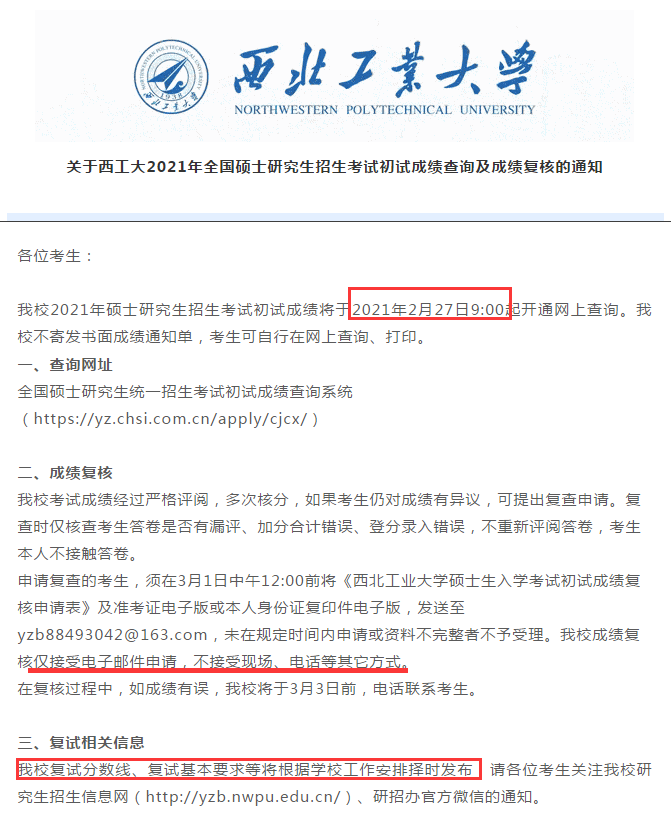 申請復查的考生,須在3月1日中午12:00前將《西北工業大學碩士生入學考試初試成績復核申請表》及準考證電子版或本人身份證復印件電子版,發送至yzb88493042@163.com,未在規定時間內申請或資料不完整者不予受理。我校成績復核僅接受電子郵件申請,不接受現場、電話等其它方式。