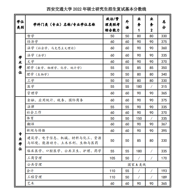 西安交通大學2022年碩士研究生招生復試基本分數線