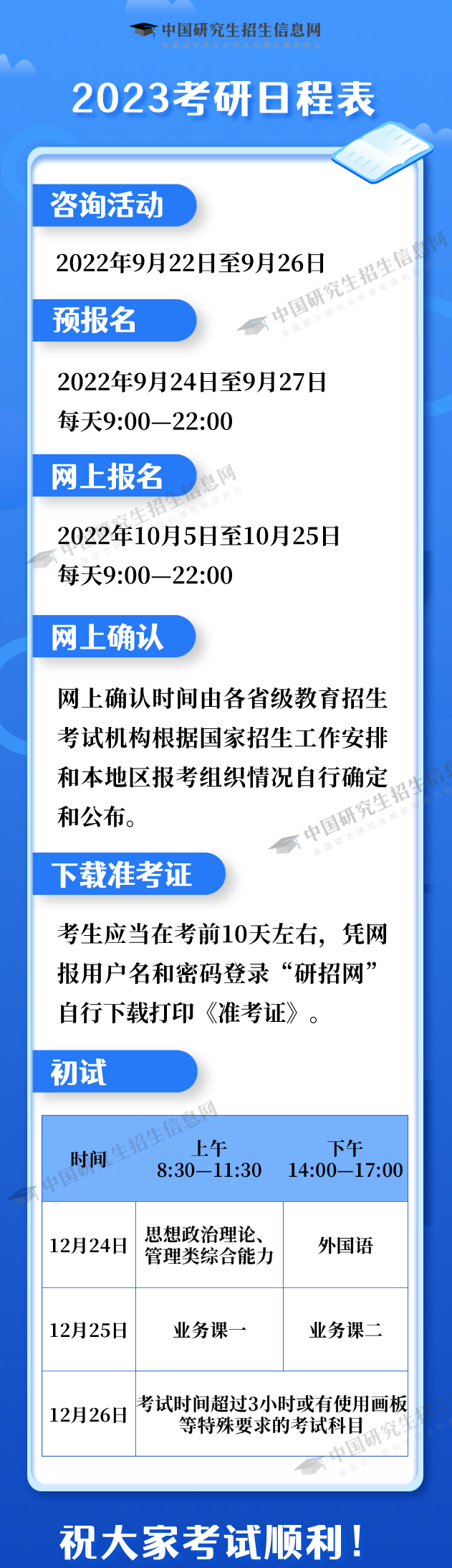 2023年全國碩士研究生招生考試初試定于2022年12月24日至25日,考試時間超過3小時或有使用畫板等特殊要求的少數考試科目安排在12月26日。網上報名工作安排在10月5日至10月25日(每天9:00—22:00),預報名工作安排在9月24日至9月27日(每天9:00—22:00)。屆時考生可登錄“中國研究生招生信息網”(網址:https://yz.ch咨詢活動:9月22日至26日新