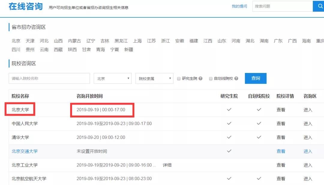 比如北大,只開放9月19日1天,并且只在0:00—17:00,北大是唯一從凌晨就可以咨詢的,不知道凌晨提問會(huì)不會(huì)得到解答,其他學(xué)校咨詢開放時(shí)間基本上都是在白天工作時(shí)間。