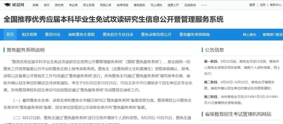 5.具有推薦免試資格的考生,須在國家規定時間內登錄“全國推薦優秀應屆本科畢業生免試攻讀研究生信息公開暨管理服務系統”(網址:http://yz.chsi.com.cn/tm)填報志愿并參加復試。截止規定日期仍未落實接收單位的推免生不再保留推免資格。已被招生單位接收的推免生,不得再報名參加當年碩士研究生考試招生,否則取消其推免錄取資格。