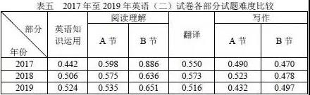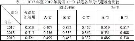 從以上表格可以看出,2017年-2019年英語二的試卷中,閱讀理解部分和寫作部分難度整體穩(wěn)定,翻譯部分難度較前兩年略微提高,但是,A節(jié)要稍難于往年,B節(jié)比往年稍易。
