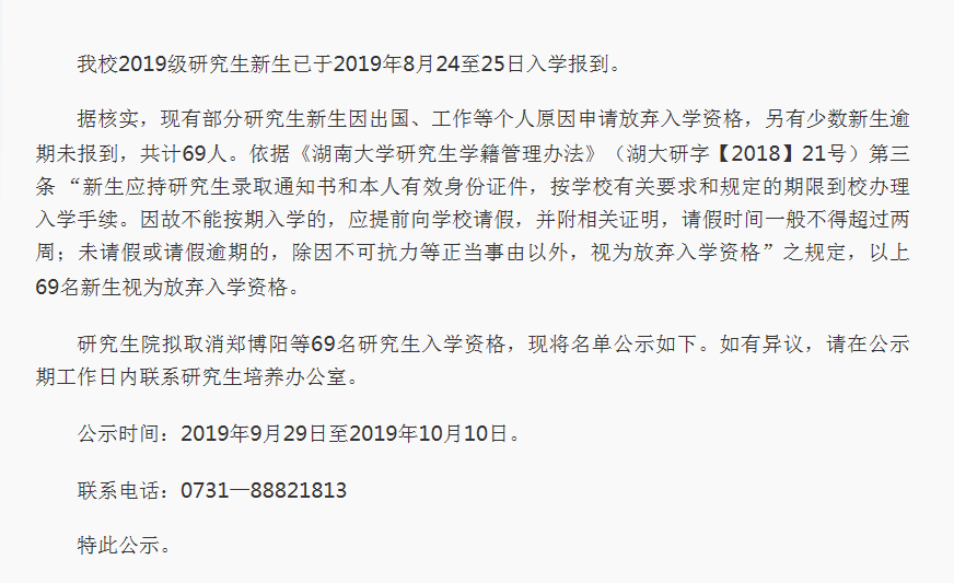 湖大此次被新生放鴿子,從湖大的公告上可以看到,這69名學生當中,多以出國留學考公務(wù)員考編或者其它原因居多,能夠看得出不少準新生因為有了更好的去處或選擇而放棄了湖南大學的研究生資格。