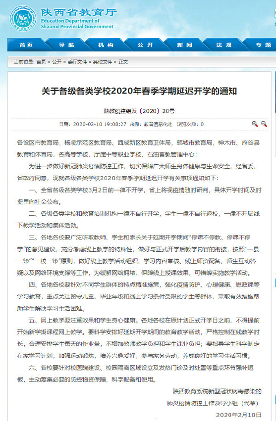 一、全省各級(jí)各類學(xué)校3月2日前一律不開學(xué),省上將視疫情隨時(shí)研判,具體開學(xué)時(shí)間及時(shí)提早向社會(huì)公布。