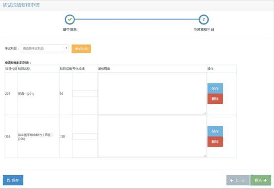 西安交通大學2020碩士研究生招生初試成績查詢、復核等事項的通知 5.在科目下拉菜單中選擇申請復核的科目,點擊“申請復核”按鈕,保存后點擊“提交”,完成成績復核申請(如下圖)。