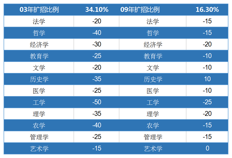03年和09年擴招,分數線均呈現降低現象。從擴招比例上看,03年擴招34.1%,國家線降幅在30分上下,09年擴招16.3%,國家線降幅平均15分上下。今年20考研擴招幅度達20%,所以今年國家線應該會有所下降。