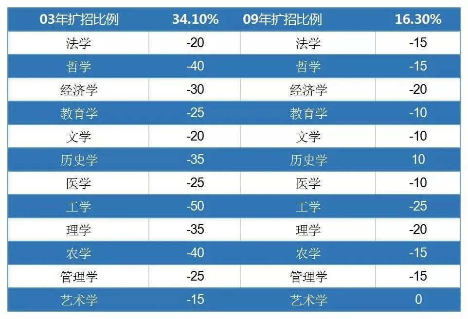 從2003年的擴招可以看出,不同學科之間在面對整體上的擴招之后,國家線的下降幅度是不同的,而且相差巨大,我們從前文中可以看出,是在15-50分之間,分數(shù)下降的最多的是工學,下滑分別達到了50分和25分,而國家線下降幅度最小的則是藝術學,僅僅為15%。那么我們對照這一下降來看的話,今年擴招,是不是也是這樣的一個變化呢?