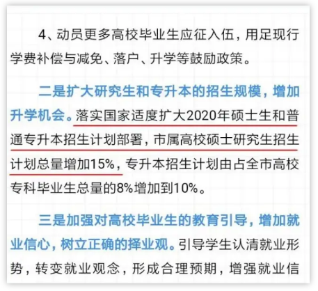 河南省在《省新冠肺炎疫情防控專題第二十場新聞發布會省教育廳就河南高校畢業生就業相關問題答記者問》,省教育廳黨組成員、副廳長刁玉華提到:盡最大努力增加應屆畢業生升學機會,教育部今年計劃擴大碩士研究生招生18.9萬人,擴大專升本招生32.2萬人。我們將認真落實有關精神,積極爭取承擔更多國家擴招任務,重點擴大我省經濟社會發展急需、就業質量高的學科專業招生,同時,指導高校著力改善辦學條件,為高質量擴招創造條件,增強大學生就業競爭力。