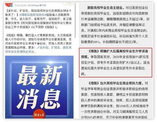 2月22日,湖南省人社廳、省教育廳、省財政廳、省衛健委聯合發布《應對新冠肺炎疫情做好高校畢業生就業創業工作十條措施》,其中一條為,明確擴大高校畢業生升學深造規模,2020年全省增加5%研究生招生計劃。