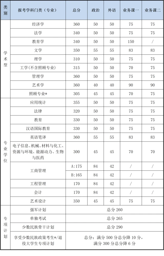 在學術碩士學位中,分數線最高的為經濟學、管理學和藝術學,都為360分,理學分數最低為310分,工學分數線為315分;