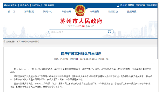 據蘇州市人民政府官網4月15日消息,西交利物浦大學決定,2019-2020學年第二學期,所有本科生和碩士研究生將繼續在線學習,本學期無需返校。