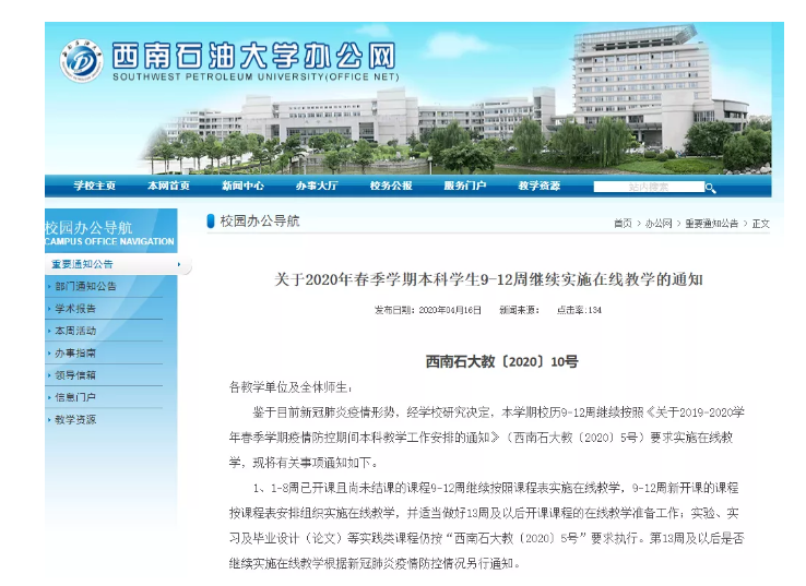 4月16日,西南石油大學官網發布《關于2020年春季學期本科學生9-12周繼續實施在線教學的通知》。通知內容提到,鑒于目前新冠肺炎疫情形勢,經學校研究決定,本學期校歷9-12周繼續按要求實施在線教學,同時請師生適當做好13周及以后開課課程的在線教學準備工作,第13周及以后是否繼續實施在線教學根據新冠肺炎疫情防控情況另行通知。
