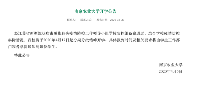 南京農業大學4月5日曾發布開學公告,稱學校將于17日起分期分批錯峰開學。據悉,因各類學生具體情況差別較大,學校尊重學生意愿,可選擇自愿返?;虿环敌?。