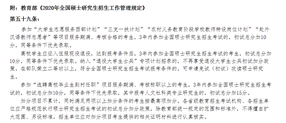 我校對參加“大學生志愿服務西部計劃”、“三支一扶計劃”、“農村義務教育階段學校教師特設崗位計劃”、“赴外漢語教師志愿者”、“高校學生應征入伍服義務兵役退役”、“選聘高校畢業生到村任職”等其他專項計劃/項目,服務期滿并考核合格的考生,執行教育部有關加分政策。