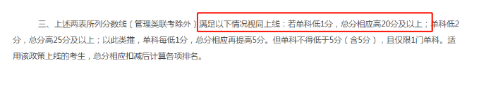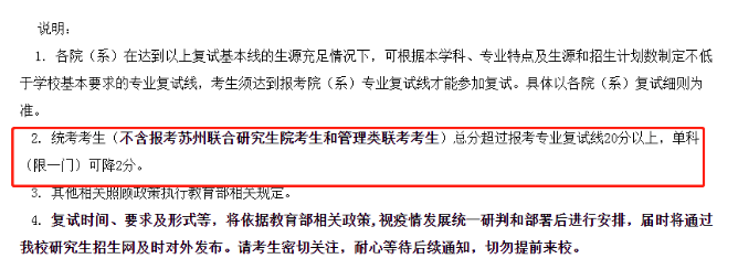 統考考生(不含報考蘇州聯合研究生院考生和管理類聯考考生)總分超過報考專業復試線20分以上,單科(限一門)可降2分。