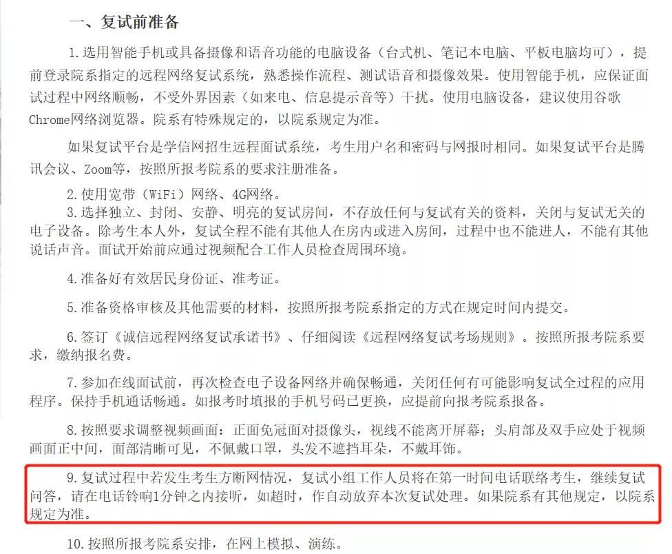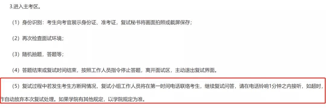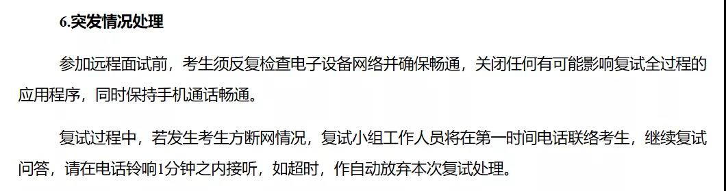 復(fù)試過程中若發(fā)生考生方斷網(wǎng)情況,面試小組工作人員將在第一時(shí)間電話聯(lián)絡(luò)考生,繼續(xù)復(fù)試問答,請?jiān)陔娫掆忢懙谝粫r(shí)間接聽,如超過1分鐘未接聽,按自動放棄本次復(fù)試處理。如果學(xué)院有其他規(guī)定,以學(xué)院規(guī)定為準(zhǔn)。