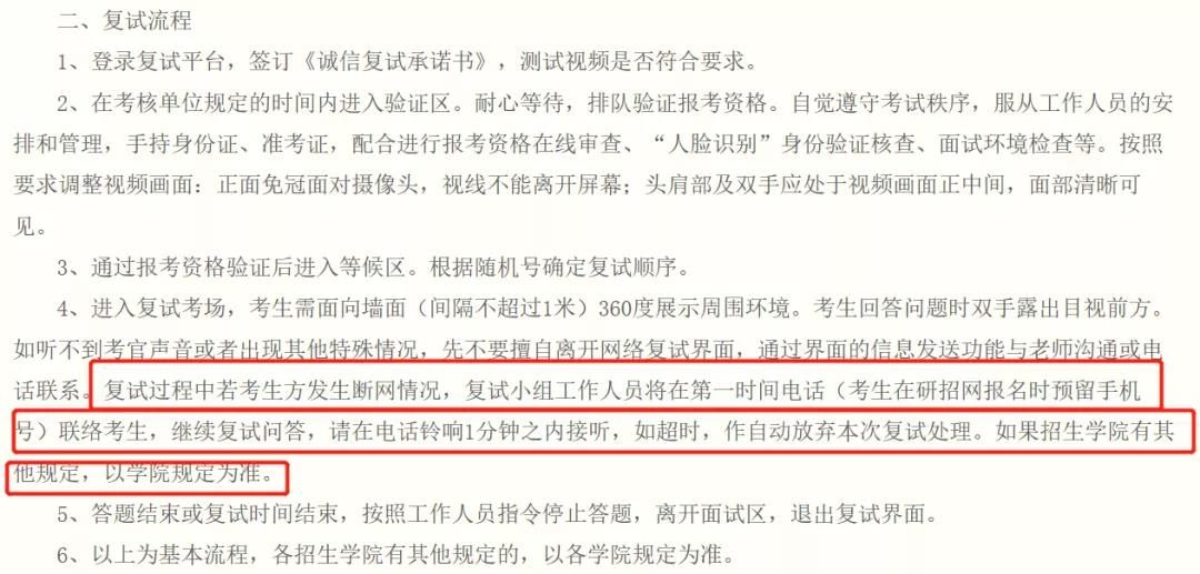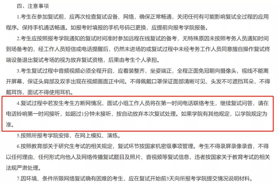 復(fù)試過程中若考生方發(fā)生斷網(wǎng)情況,復(fù)試小組工作人員將在第一時(shí)間電話(考生在研招網(wǎng)報(bào)名時(shí)預(yù)留手機(jī)號)聯(lián)絡(luò)考生,繼續(xù)復(fù)試問答,請?jiān)陔娫掆忢?分鐘之內(nèi)接聽,如超時(shí),作自動放棄本次復(fù)試處理。如果招生學(xué)院有其他規(guī)定,以學(xué)院規(guī)定為準(zhǔn)。