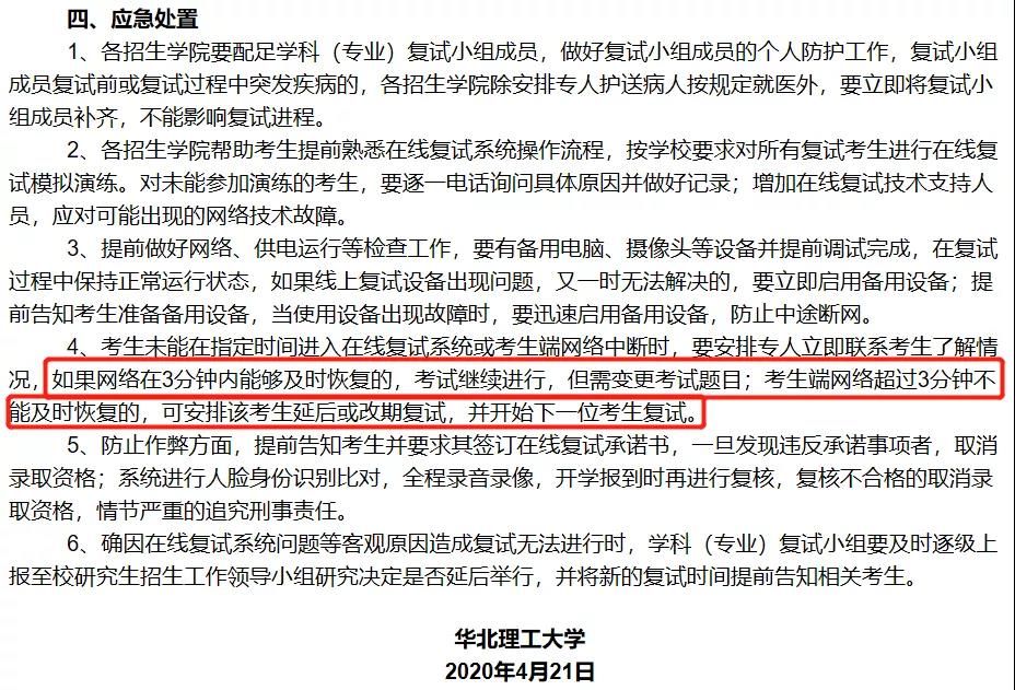 如果網(wǎng)絡(luò)在3分鐘內(nèi)能夠及時(shí)恢復(fù)的,考試?yán)^續(xù)進(jìn)行,但需變更考試題目;考生端網(wǎng)絡(luò)超過3分鐘不能及時(shí)恢復(fù)的,可安排該考生延后或改期復(fù)試,并開始下一位考生復(fù)試。