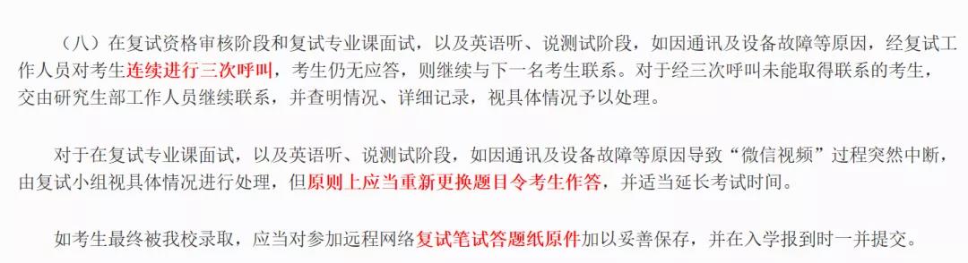 對于在復(fù)試專業(yè)課面試,以及英語聽、說測試階段,如因通訊及設(shè)備故障等原因?qū)е?ldquo;微信視頻”過程突然中斷,由復(fù)試小組視具體情況進(jìn)行處理,但原則上應(yīng)當(dāng)重新更換題目令考生作答,并適當(dāng)延長考試時(shí)間。