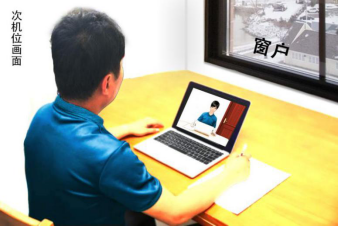 主機(jī)位為面試主機(jī)位(最好為筆記本電腦或臺(tái)式機(jī)),面向考生,用于考官對(duì)考生的遠(yuǎn)程視頻考核。放置面試主機(jī)位的書桌應(yīng)緊貼墻面擺放,主機(jī)位攝像頭覆蓋房間門口??荚囬_始時(shí)考生將主機(jī)位攝像頭環(huán)繞360度,使面試人員查看考場(chǎng)全部場(chǎng)景??忌救苏龑?duì)設(shè)備攝像頭,保持坐姿端正,面部、上半身及雙手在畫面中清晰可見。示意圖如下: