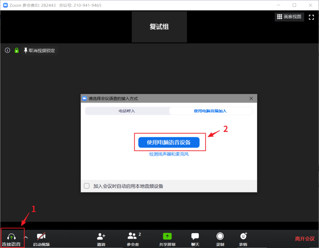 1.面試秘書(shū)邀請(qǐng)考生進(jìn)入復(fù)試考場(chǎng)后,考生須點(diǎn)擊左下角連接語(yǔ)音