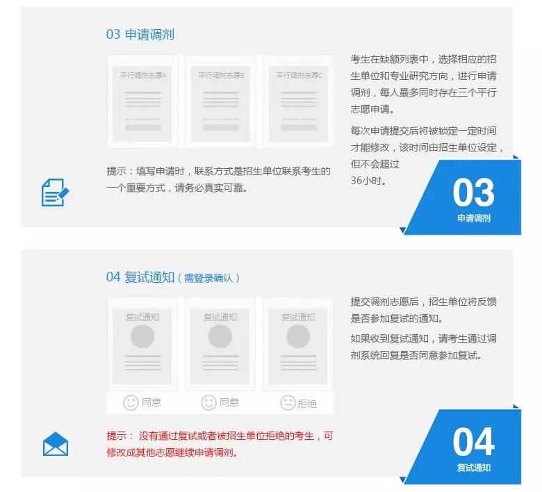 考生如果收到招生單位發(fā)送的復(fù)試通知,須在招生單位規(guī)定的時(shí)間內(nèi)回復(fù)是否同意參加復(fù)試。復(fù)試沒有通過的考生仍可繼續(xù)填報(bào)其他調(diào)劑志愿。