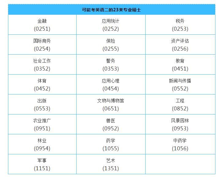 以下23類專業碩士,初試科目的外國語考試可選擇使用英語一或英語二,選擇權由招生單位行使,考生不能選擇初試科目。