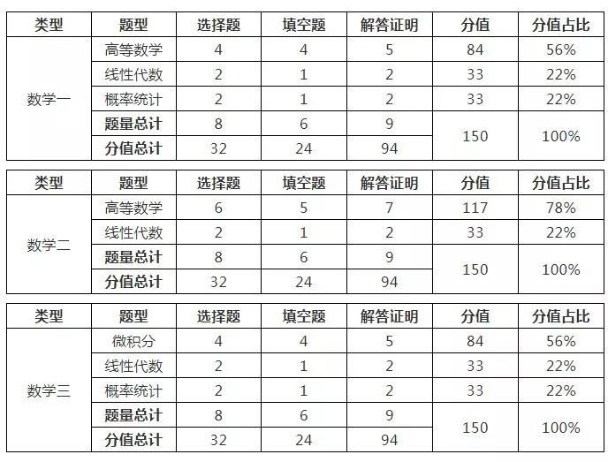 數學一、二、三均考察線性代數,所占比例均為22%,而且是數一數二數三考試內容中差別最小的科目,很多年份,考研真題線代部分都是完全一樣的,唯一不同的是數一的大綱中多了向量空間部分的知識。