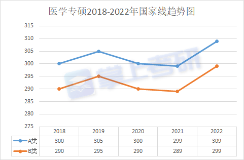 醫學門類專碩2018-2022年國家線趨勢圖